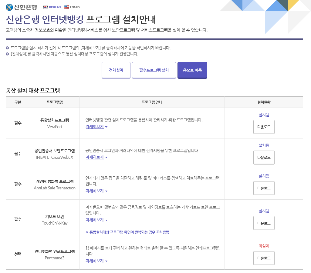 신한은행 인터넷뱅킹 프로그램을 아래와 같이 설치한 후 특이하게도 인증서 로그인 시 에러가 발생됩니다.